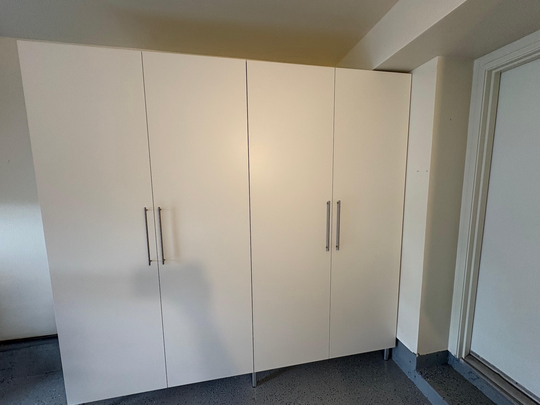 A recent project with our friend, Edwin Lopez. We installed cabinets, overhead garage shelving with hooks, and epoxy flooring!