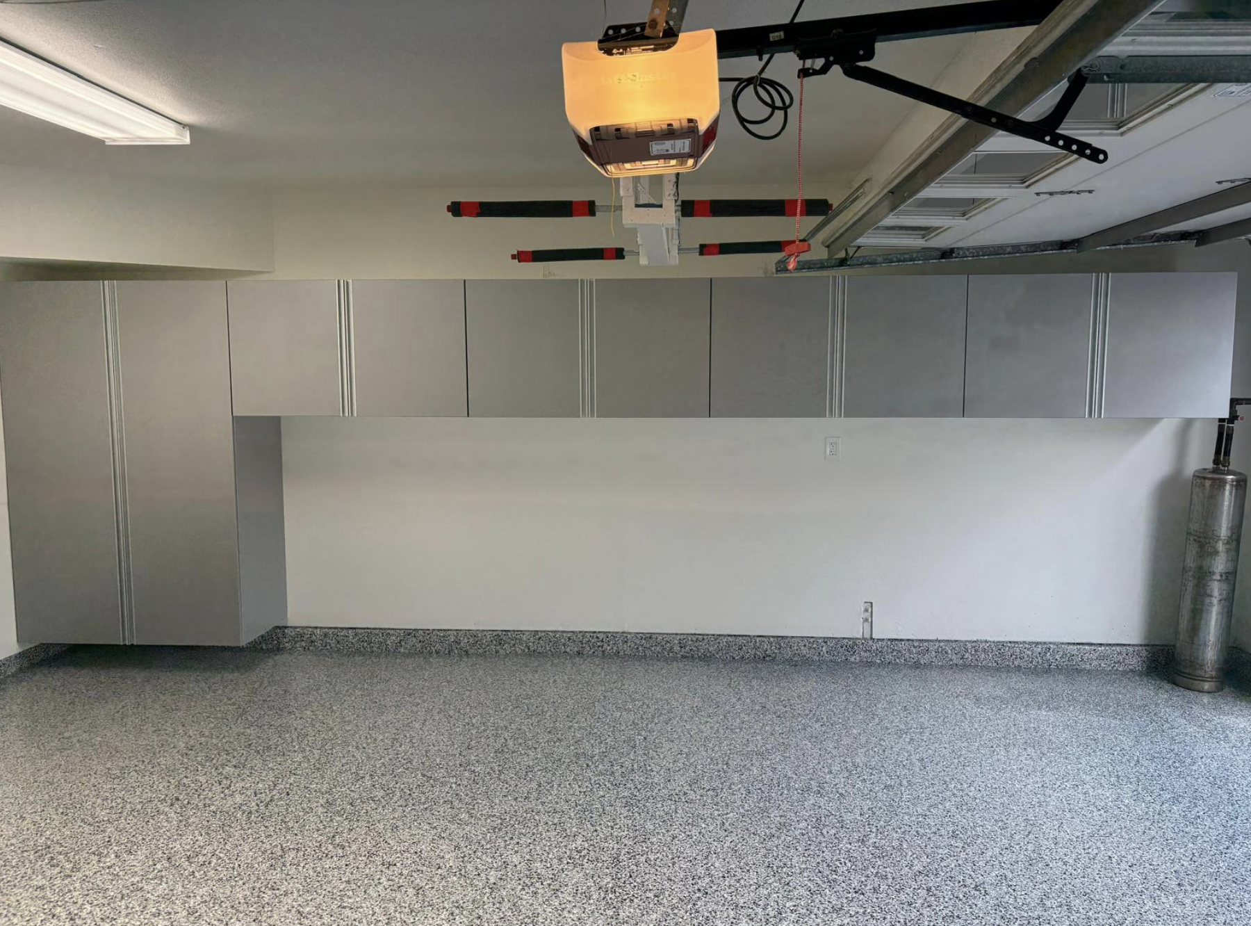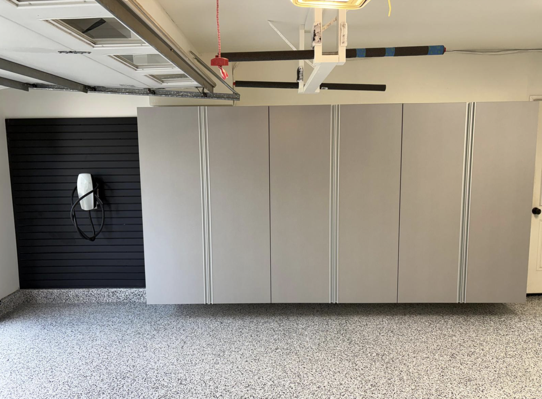 We installed a combination of cabinets and slatwall to create a more organized and efficient layout. The cabinets provide hidden storage to keep items neatly out of sight, while the slatwall offers easy-access organization for tools and frequently used gear. The result is a clean, streamlined garage where everything has its place—and most importantly, the client was very happy with the turnout.